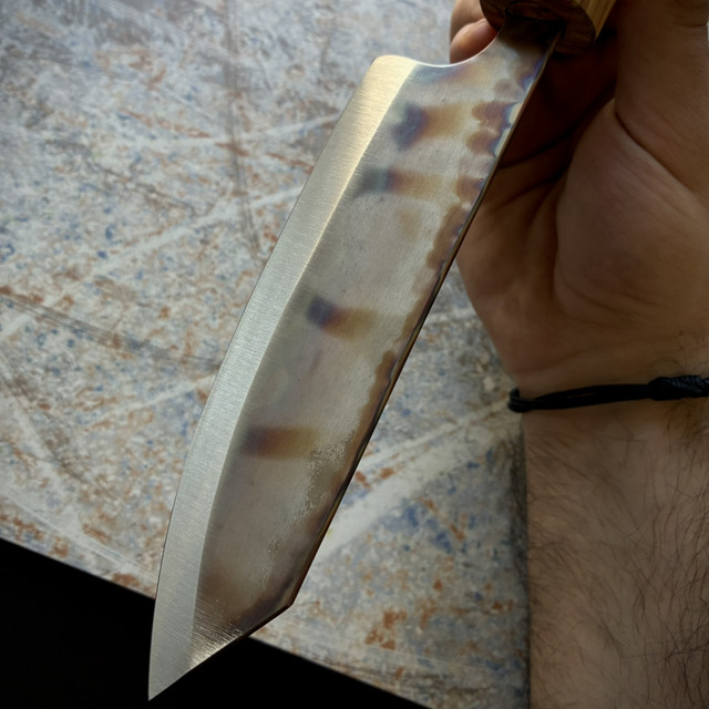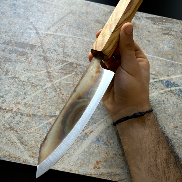 Gyuto en bois de fer d’Arizona et carbone cuivre. Tranchant 15cm, acier 14c28n